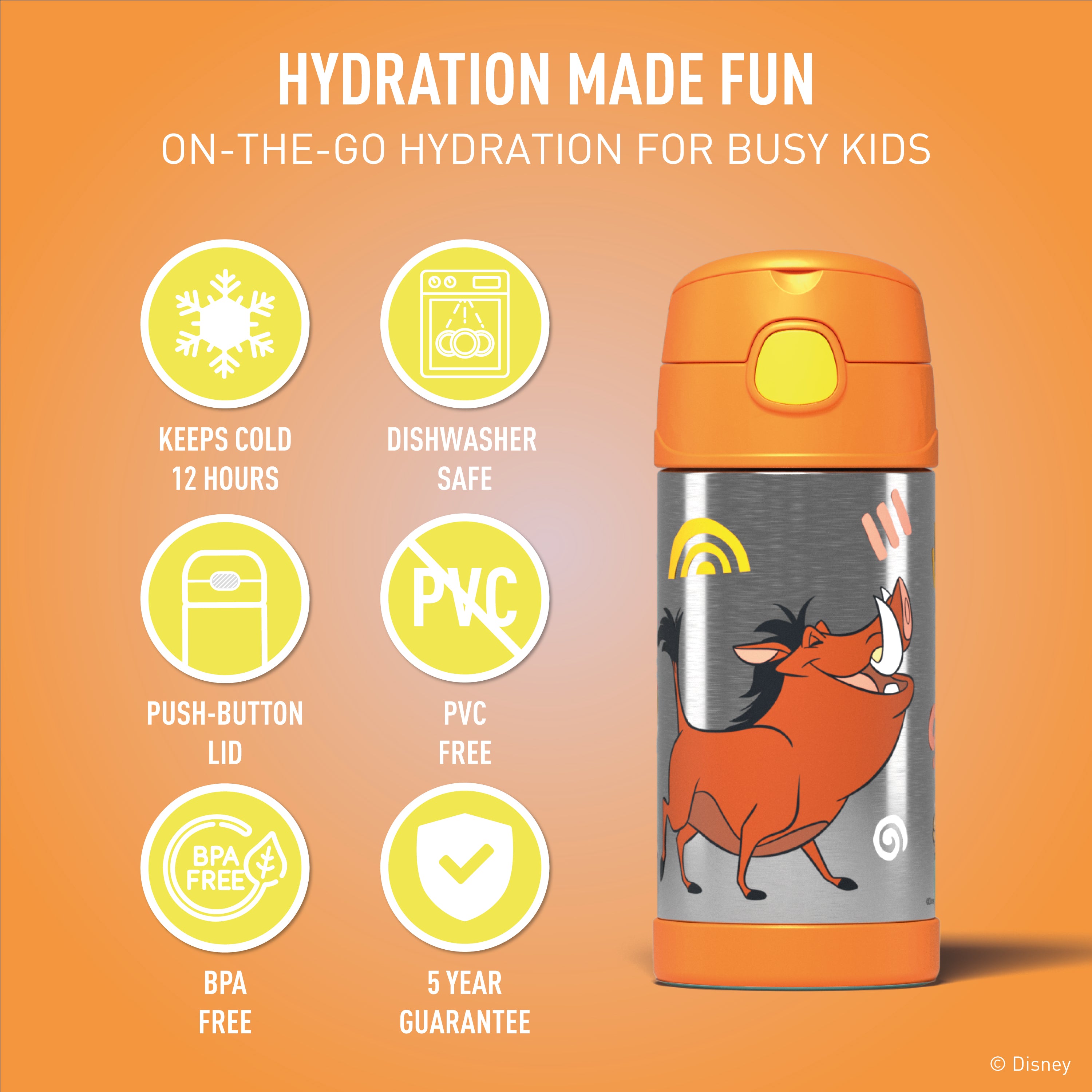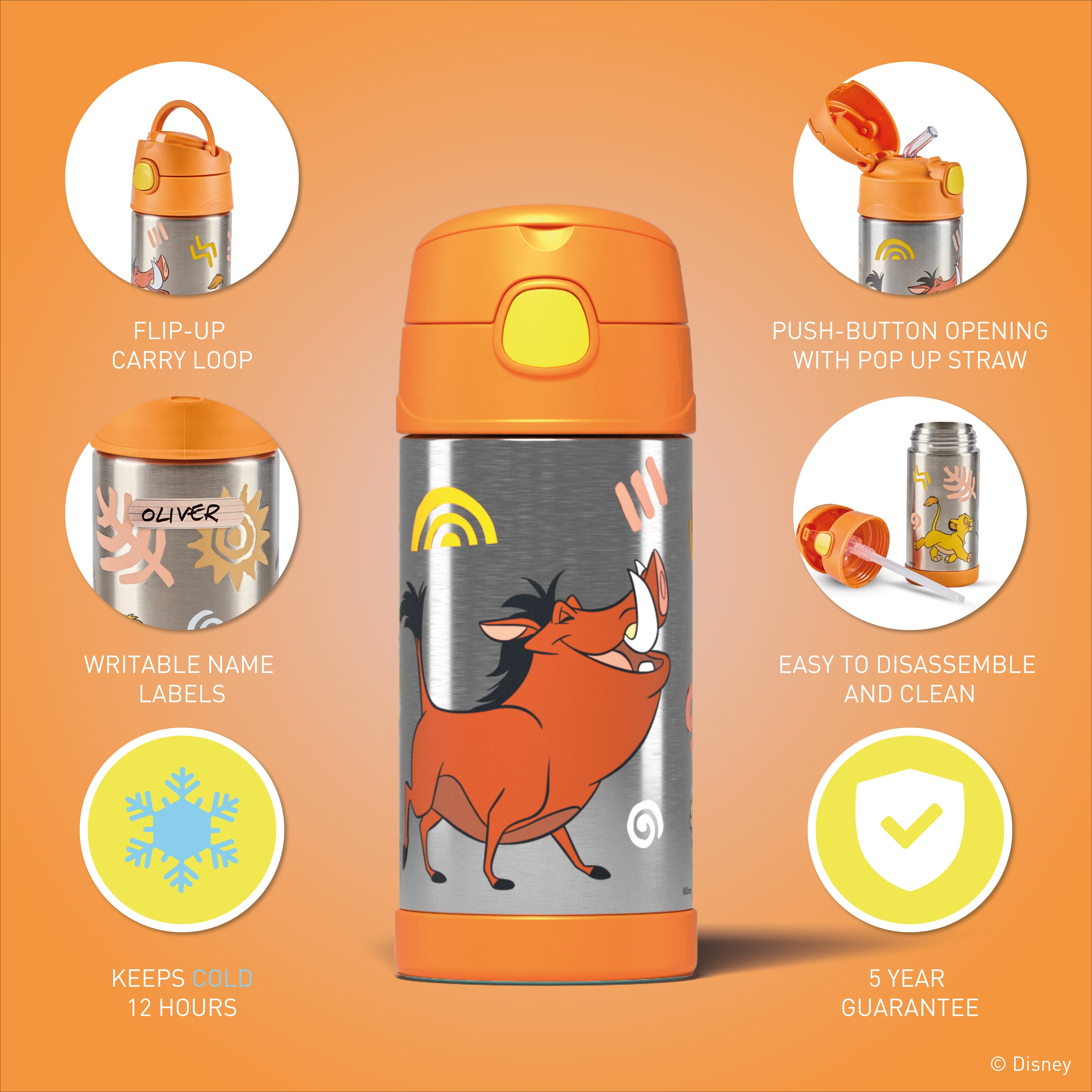 Keep your child hydrated in style with theFUNtainer® Bottle 355ml - Disney Lion King. This durable, BPA-free stainless steel bottle keeps drinks cold for 12 hours. It features a hygienic push-button lid, pop-up straw, flip-up carry loop, and writable name labels. Dishwasher safe and backed by a 5-year warranty.