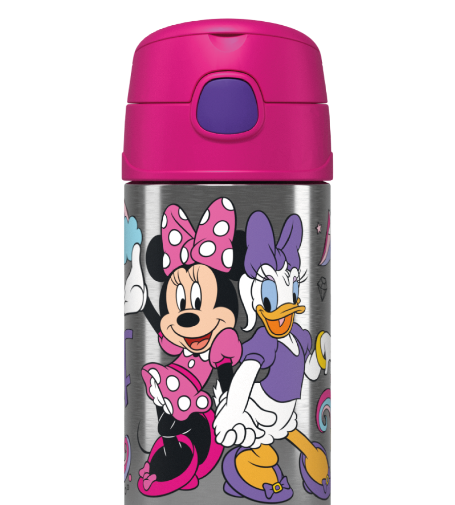 Keep your child hydrated in style with the FUNtainer® Bottle 355ml - Disney Minnie & Daisy. This durable, BPA-free stainless steel bottle keeps drinks cold for 12 hours. It features a hygienic push-button lid, pop-up straw, flip-up carry loop, and writable name labels. Dishwasher safe and backed by a 5-year warranty.